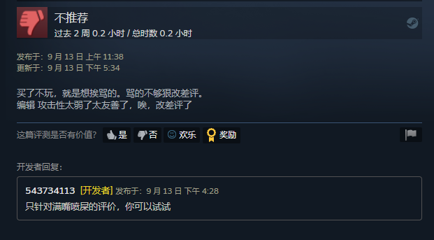 说真的,如今这个互联网上有攻击性的老哥不算少,但在steam的评测列表能够展现出如此强大攻击性的开发者,这位开发《夜不收:荡寇风云》的老哥应该是独一份。