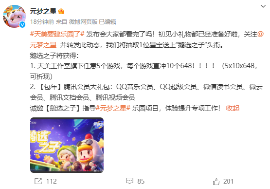 在发布会最后,游戏官方还给大家送了不少超级福利,包括QQ超级会员年卡、腾讯视频VIP年卡QQ音乐年卡、微信读书年卡、微云年卡、腾讯文档会员年卡以及天美工作室旗下任意五款游戏各10个648礼包的“鹅选之子”奖。只要拿起手机,前往元梦之星官方微博,参与转发抽奖即可有机会成为鹅选之子,获得企鹅家族的大礼包。