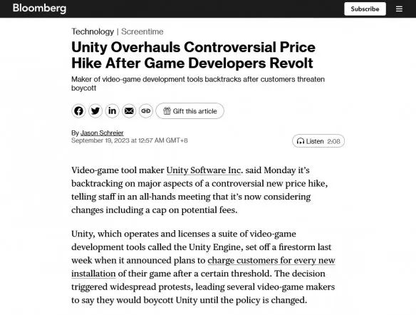 不过,Unity这种如同“杀鸡取卵”式的吸血,其实在之前就有所预兆。早在去年这个时候,Unity的付费专业版价格就进行了一波提升,官方给出的理由是引擎的研发成本过高,所以除了免费的个人版外,不同版本的标价都有一定程度的上涨。
