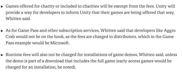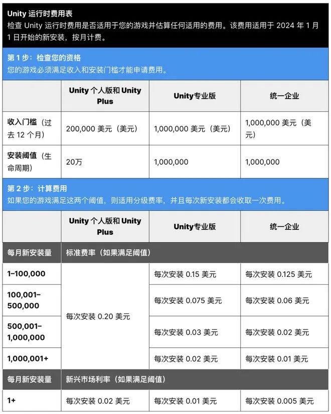 根据彭博社的最新报道来看,Unity暂时的新计划是对那些收入超过100万美元的游戏收取4%的费用,但低于该金额的游戏是否会被收费?收费标准是怎样的?目前还没有一个明确的消息。
