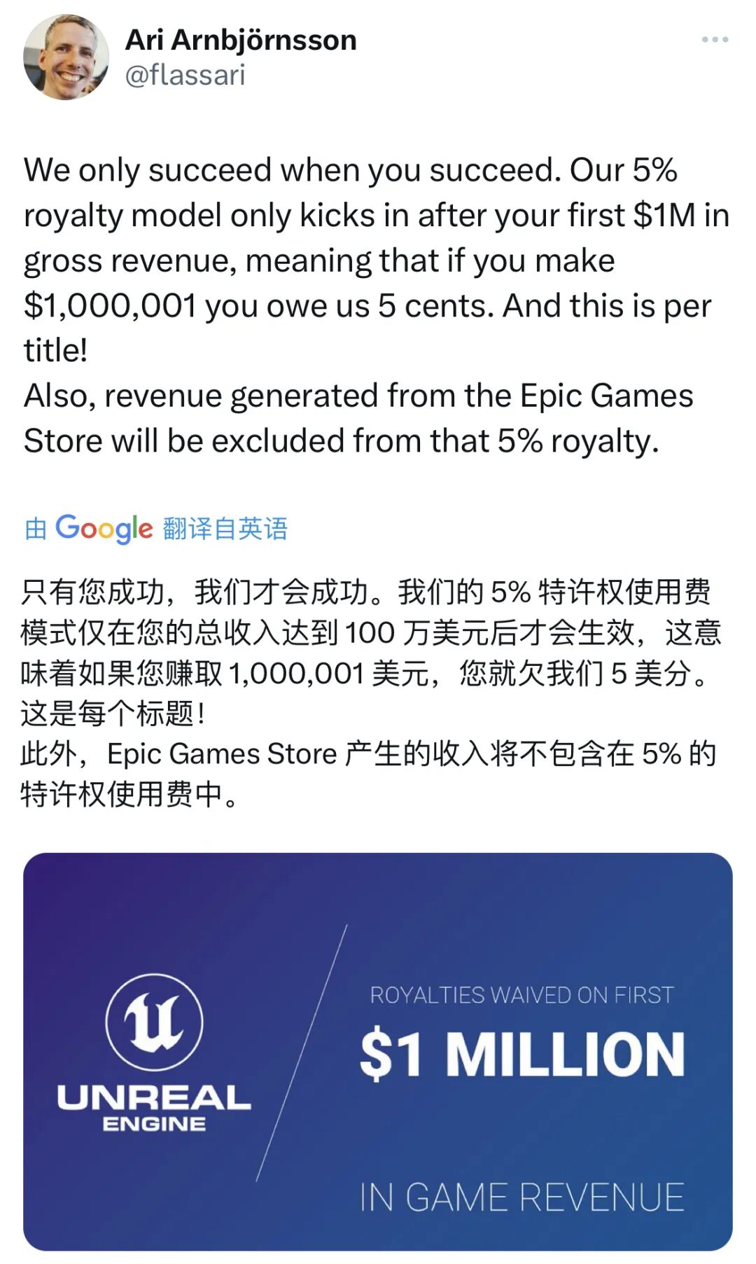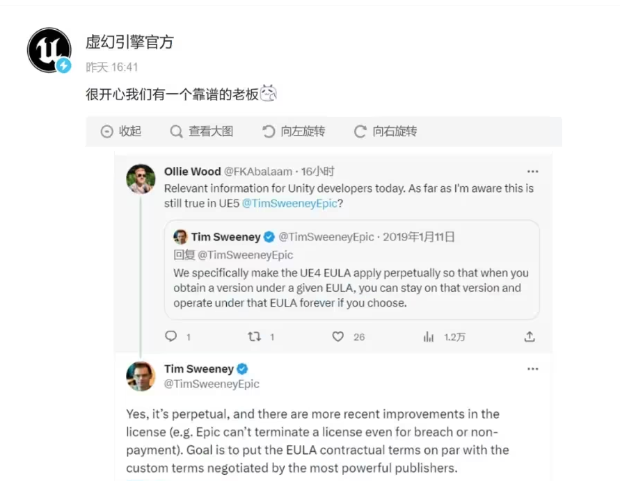 更巧的是,Unity定下的这个收费门槛和虚幻引擎几乎一样,但二者截然不同的吃相,让这位虚幻引擎工作人员的推文又给了Unity一记响亮的耳光。