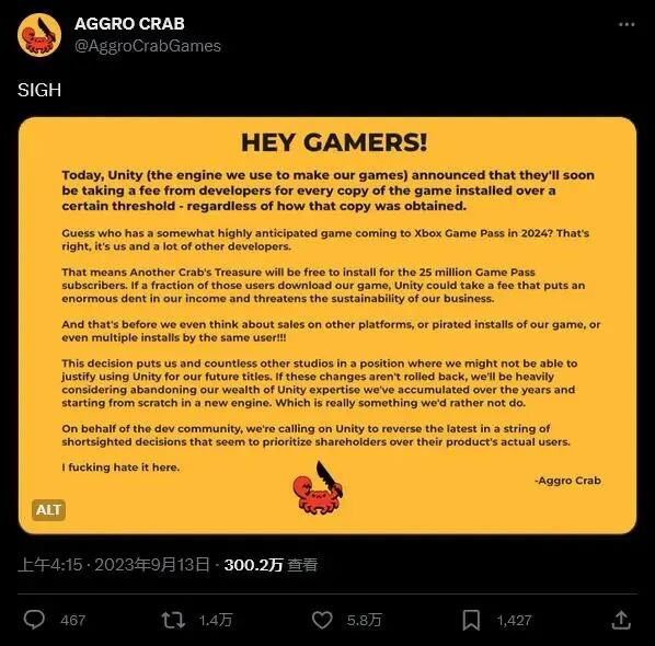 事实上,针对这个以安装次数为标准进行收费的模式,众多开发者除了强烈的不满外,同样也表达了对Unity官方的诸多疑问。比如部分开发者就明确表示自己的游戏在制作完成并发布后,将会同步登录XGP,这种情况下势必会让安装人数和游戏人数有所增加。这原本是一件好事,但如果需要为此向Unity支付额外的费用,那选择登录XGP可能会成为一个不折不扣的“馊主意”。