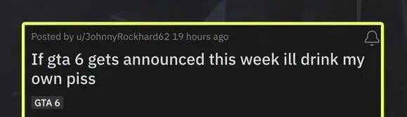 当然了,最有趣的还要算Reddit上这位id为“JohnnyRockhard62”的老哥,此前他发帖称“要是《GTA6》在本周官宣我就喝自己的尿!”没想到R星似乎感知到了他深情的呼唤,在当晚发布了《GTA6》预告片的推文,这……