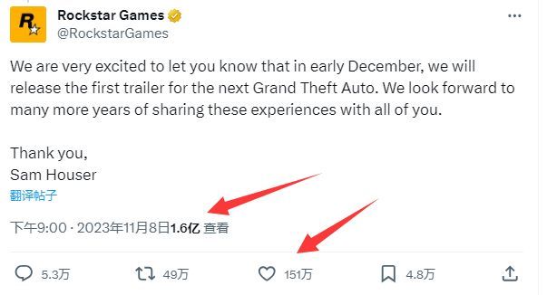 这条推文发布以后,立即打破了推特的纪录:点赞数超过了151万人,浏览量达到了惊人的1.6亿!无数玩家为之高潮,为之彻夜难眠!要知道前作《三男一狗》已经推出超过10年了,10年前小编还是个处男,想不到如今《GTA6》都公布了,我竟然还是个处男?emmm,不禁让人感叹霍格沃茨魔法的力量(狗头)……