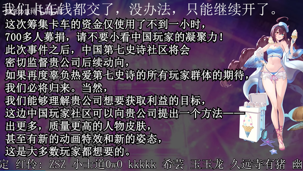 当然,尽管官方发布道歉视频已经很快,但众筹已经完成,卡车也已经租好。本着“买都买了、来都来了”的原则,玩家们只是调整了一下车载视频的内容,依然让大卡车按照原定计划出现在了笑门公司的楼下。除了中间的“声讨书”之外,最上方的一行字其实更加显眼:你们道歉太晚,我们卡车钱都交了,没办法,只能继续开了。