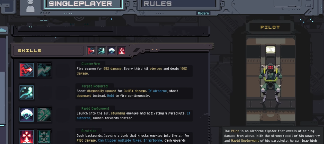 飞到空中,给予敌人来自各个方位和角度的打击,是【飞行员】的特色,但也会让他变得更难以操作,毕竟横版2D的战斗里,一个空中角色的操作是相对较难的。