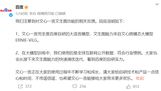 “文心一言的文生图能力来自于文心跨模大模型ERNIE-ViLG。而在训练中我们使用的是全球互联网公开数据,符合行业惯例。”