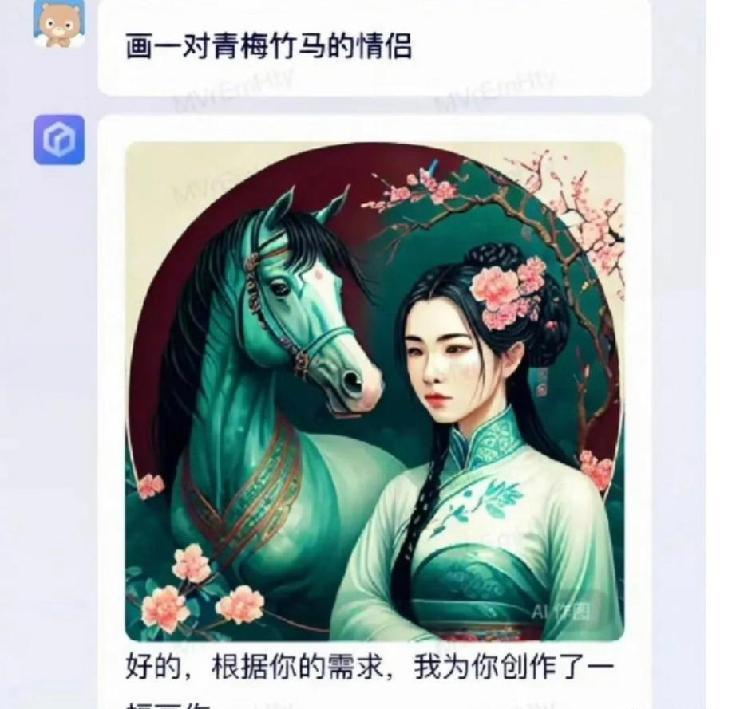 或许通过上面两张图片,你已经掌握了文心一言的绘图心得,而在看到下面这张“青梅竹马”,你也就不奇怪了。