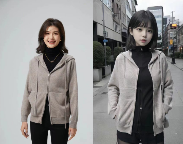 对于店家来说,AI模特的诞生能够给他们带来更多的便利。不仅仅是省钱,还能够提高效率,这样一键生成的方式能够让他们随时随地的上架新的的产品。