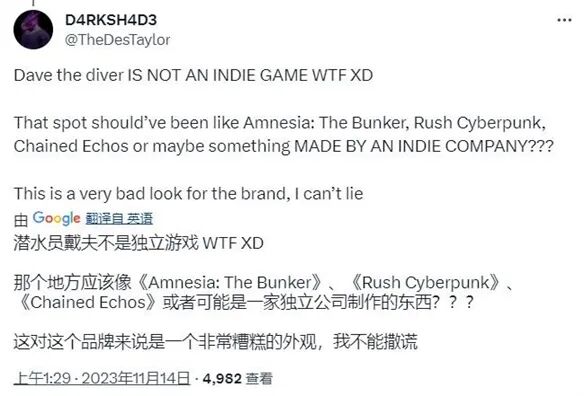 想想看,要是《潜水员戴夫》真的被认定为“独立游戏”的话,那些大厂会不会都来试水“独立游戏”,而那些大厂无论是资金、技术还是渠道,对于一般的独立游戏开发者来说,都是降维打击。这不但会进一步加剧“独立游戏”领域的竞争,还会导致真正的“独立游戏”生存更加艰难。