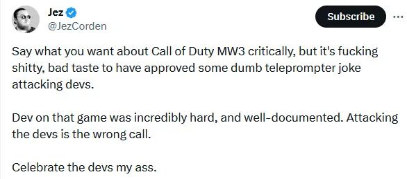有人怀疑,这句话是 贾奇 从提词器上念出来的,而不是他自己的想法。外媒Windows Central的高级编辑Jez Corden也表示:“你有权利对《使命召唤:现代战争 3》提出批评,但是用一些愚蠢的提词器笑话来羞辱开发者,就太过分了。”