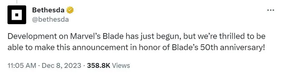 B社官方发推表示,《漫威刀锋战士》的开发工作才刚刚开始,不过因为今年是刀锋战士50周年,所以他们就在今年的TGA上公开了这款游戏。