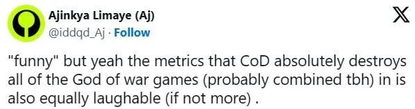 这句话立刻引发了《使命召唤》社区的反弹。曾经参与《使命召唤》开发的 Infinity Ward 员工 Ajinkya Limaye 在社交媒体上回应道:“‘有意思’吗?那么,《使命召唤》的销量无疑碾压了《战神》(可能是整个系列的总和),这也很‘有意思’吧。”