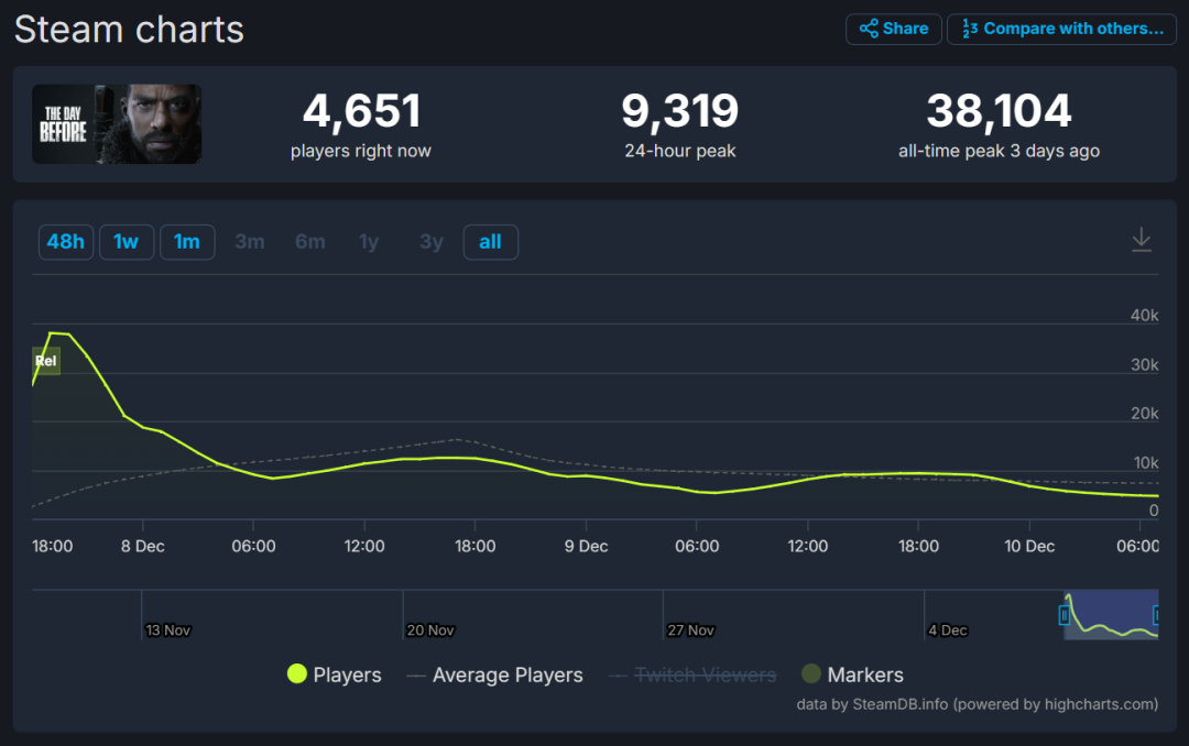 截至发稿时,Steam商店页面显示《浩劫前夕》的评价数超过16000条,好评率仅有19%,为“差评如潮”。此外,游戏的玩家热度也出现了断崖式的下滑。据Steamdb数据显示,本作在发售当日的在线人数峰值曾一度达到38104人,然而仅在不到一天内,玩家人数便大幅下滑,骤降超过85%,最低时甚至只有不到5000人在线。