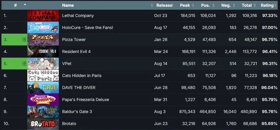 从最高同时在线人数来看,《致命公司》以超过18万人的数字雄踞2023年新游戏排名的第三位,发售一个月的预估销量也已然超过300万份。