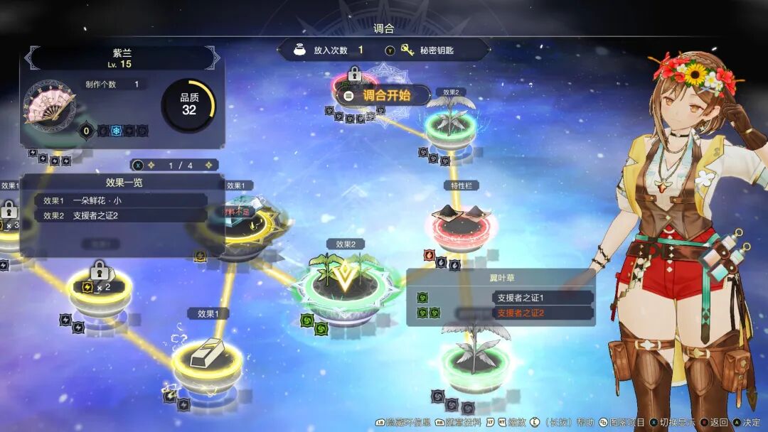 讲完采集,我们来聊聊炼金。《莱莎3》采用了与系列前两作相似的炼金系统。一般来说,一种炼金产物的形成需要两种主要素材;然后通过“拼图”的方式凑齐连线所需的属性,才能加入额外的投料为产物提高品质、附加特性和超特性,甚至改变产物性质。
