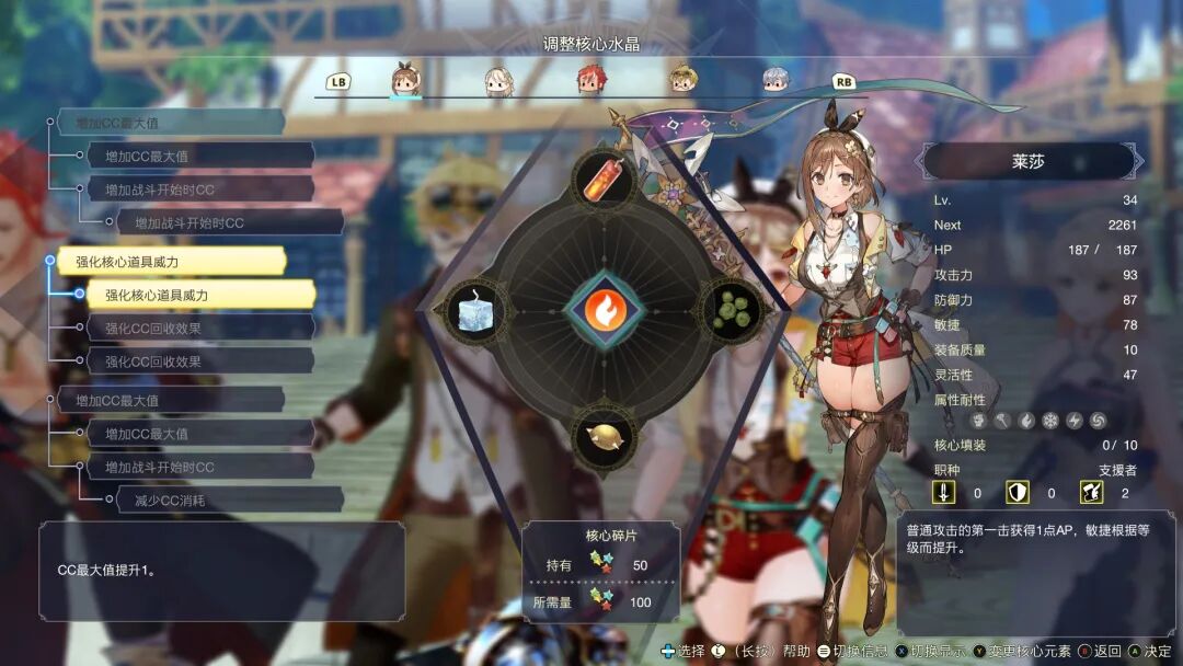 由于本作获取SP的手段相比之前多了不少,用SP解锁的天赋树内容也很多。除了采集上的增益和炼金配方的解锁,《莱莎3》的天赋树还包含一些战斗增益,包括解锁角色的核心水晶调整,以及增加“钥匙”的持续时间。