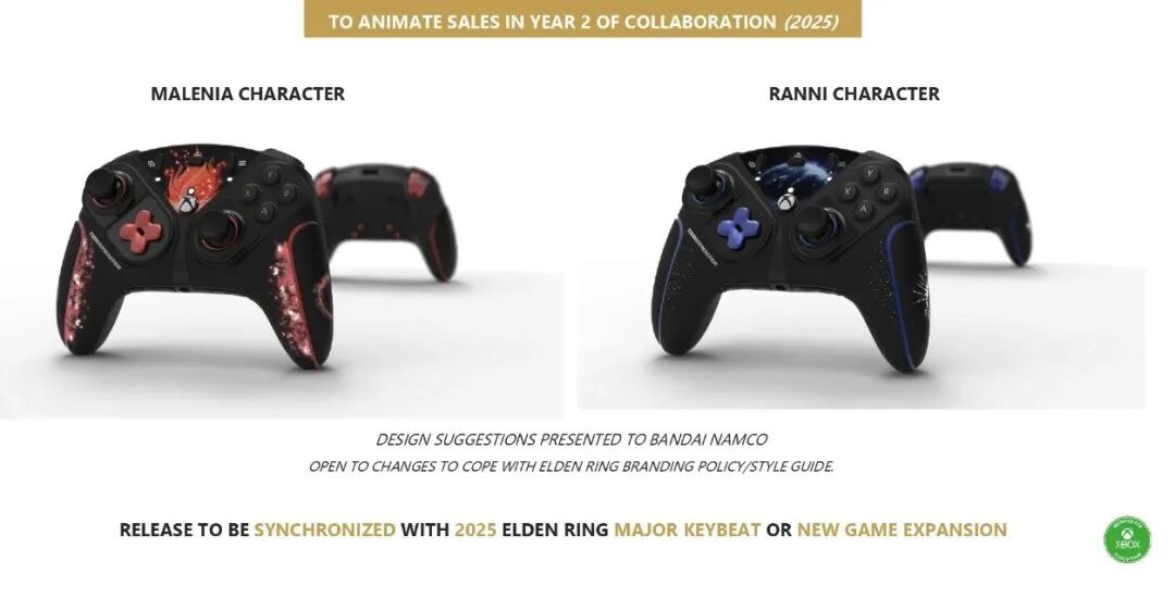 另外,Thrustmaster 还定制了额外两款《艾尔登法环》主题Xbox手柄,分别是 女武神 玛莲妮亚 主题 和 月之公主 菈妮 主题(如下图),页面上称为推动第二年的合作,将在“2025年与《艾尔登法环》的新扩展或‘Major Keybeat’同步发售”。