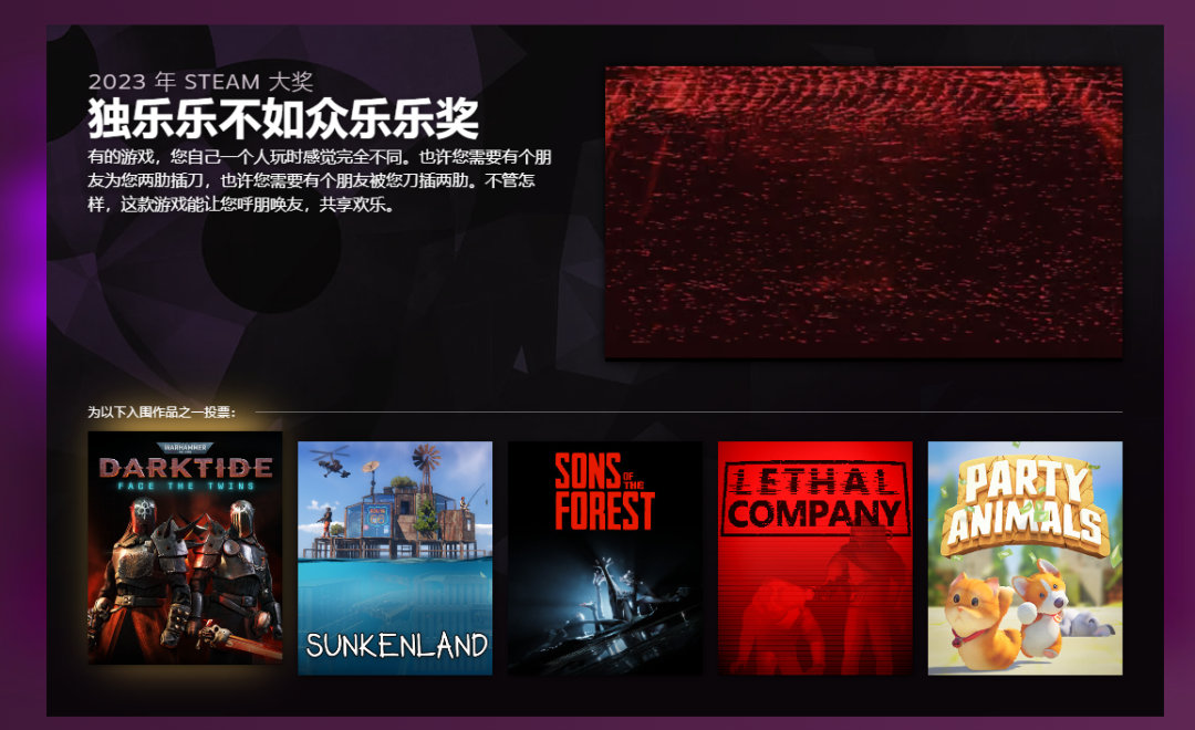 独乐乐不如众乐乐奖提名:《战锤40K:暗潮》《沉没之地》《森林之子》《致命公司》《猛兽派对》