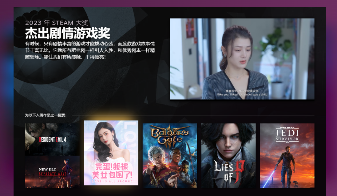 杰出剧情游戏奖提名:《生化危机4重制版》《完蛋!我被美女包围了》《博德之门3》《匹诺曹的谎言》《星球大战 绝地:幸存者》
