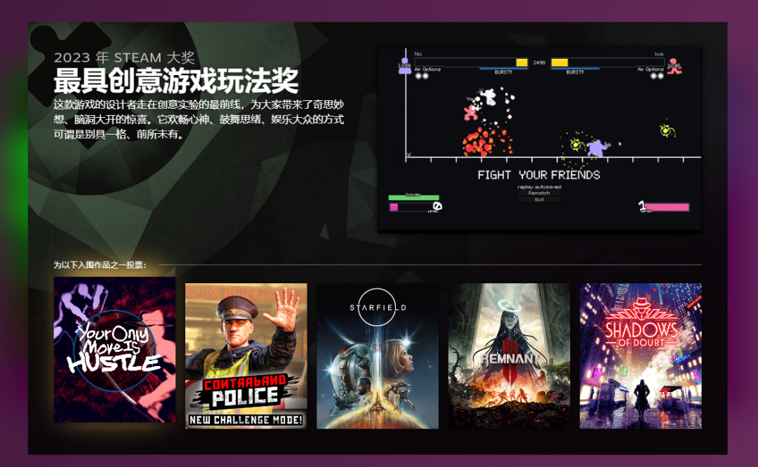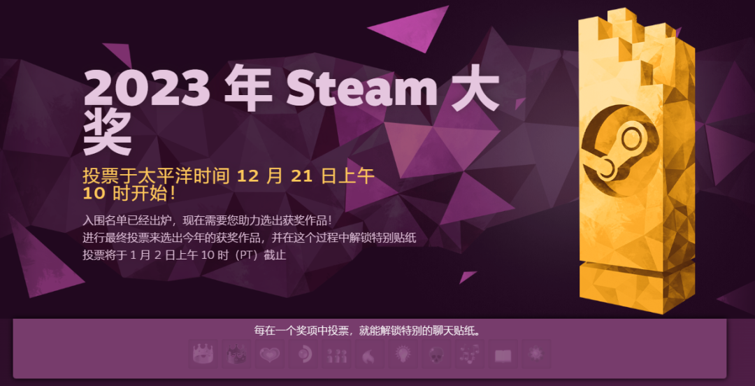 Steam游戏大奖投票时间为12月22日凌晨2点~2024年1月3日凌晨2点,投票开始后玩家每在一个奖项中投票,就能解锁一个特别的聊天贴纸。