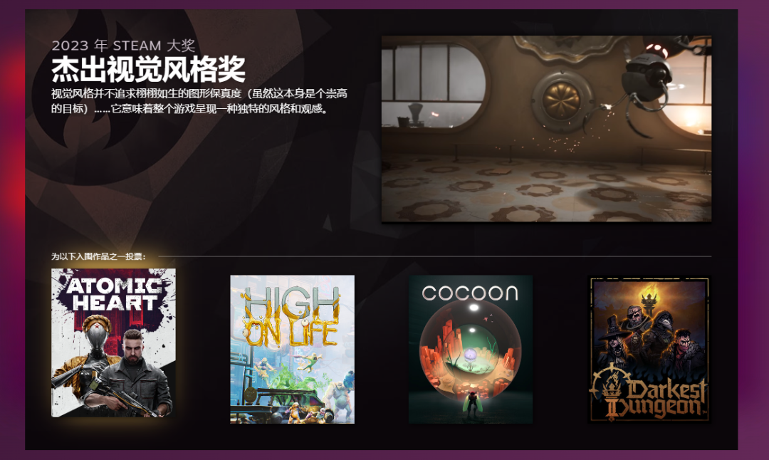 杰出视觉风格奖提名:《原子之心》《High On Life》《COCOON》《暗黑地牢2》