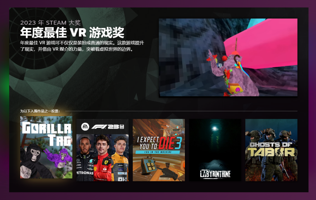 年度最佳 VR 游戏奖提名:《Gorilla Tag》《F1 23》《我希望你死3:机巧环环相扣》《迷宫探险》《Ghosts of Tabor》
