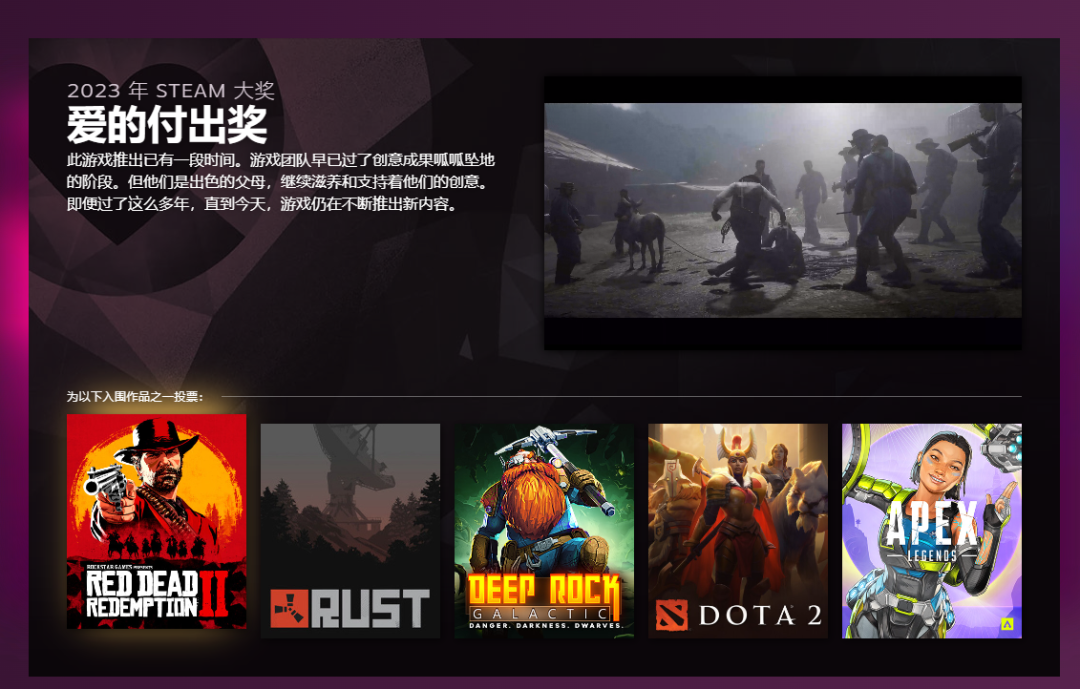 爱的付出奖提名:《荒野大镖客2:救赎》《Rust》《深岩银河》《Dota2》《Apex英雄》