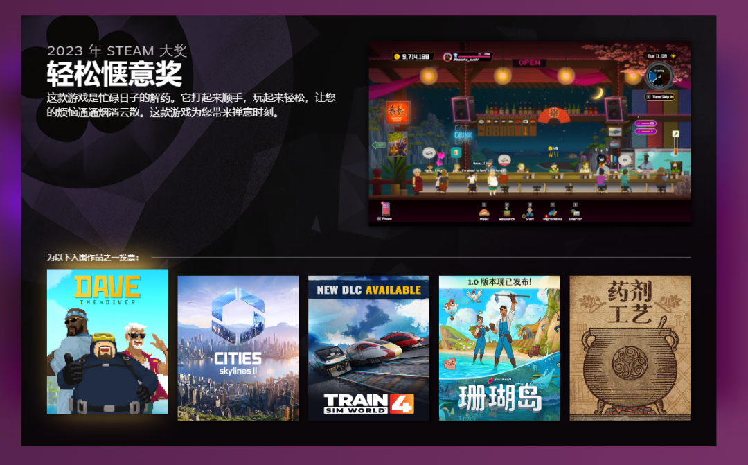 轻松惬意奖提名:《潜水员戴夫》《城市:天际线2》《模拟火车世界 4》《珊瑚岛》《药剂工艺:炼金模拟器》