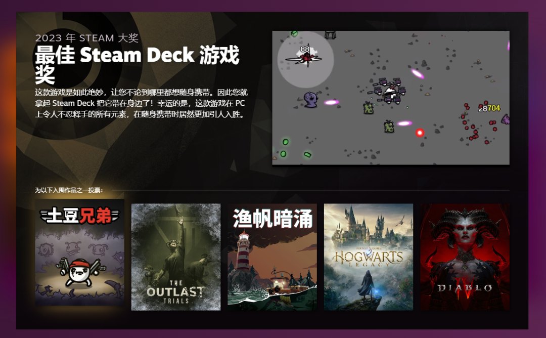 最佳 Steam Deck 游戏奖提名:《土豆兄弟》《逃生:试炼》《渔帆暗涌》《霍格沃茨之遗》《暗黑破坏神4》