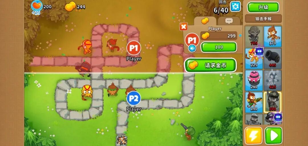 而我们也从一开始的有说有笑,逐渐演变成了后续“你补两个机枪,别放炮了,马上刷黑气球!!”“给点钱给点钱,你看你手里钱那么多还没用,我这边猴子还没升级呢”(联机模式下金币收益平均分配,但能够将金钱给予对方)。