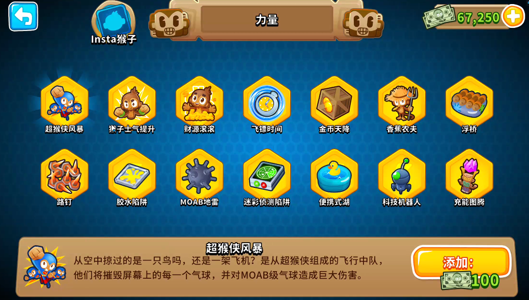 不仅如此,玩家自己还拥有着足够强力的支援技能,以及充当一次性消耗道具的“力量”。比如能够将场上所有气球消灭的“超猴风暴”,在陷入困境时就近乎等同于第二条命。飞镖时间则是将游戏时间减慢,进而争取更多的时间进行调整、消灭场上的气球。