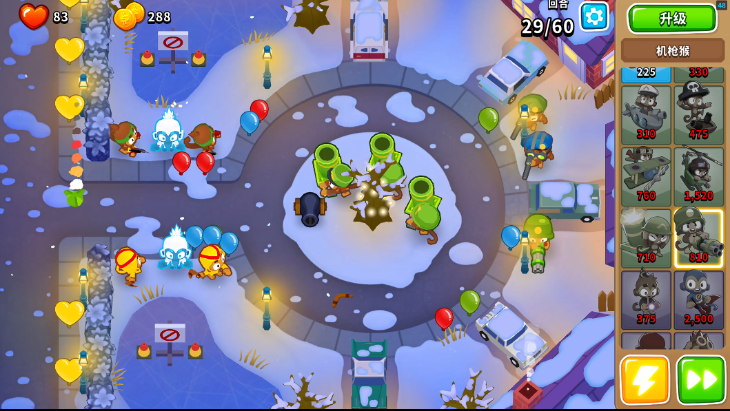 一直对黑气球无能为力的迫击炮猴,在强化到上路5级或是中路3级之后,就具备了消灭黑气球的能力。原本火力就相当强大的机枪猴,在点出了“激光炮”这项能力之后,不仅伤害和穿透能力会有所提升,同时还获得了击破冰冻气球的额外能力(不能击破紫气球)。