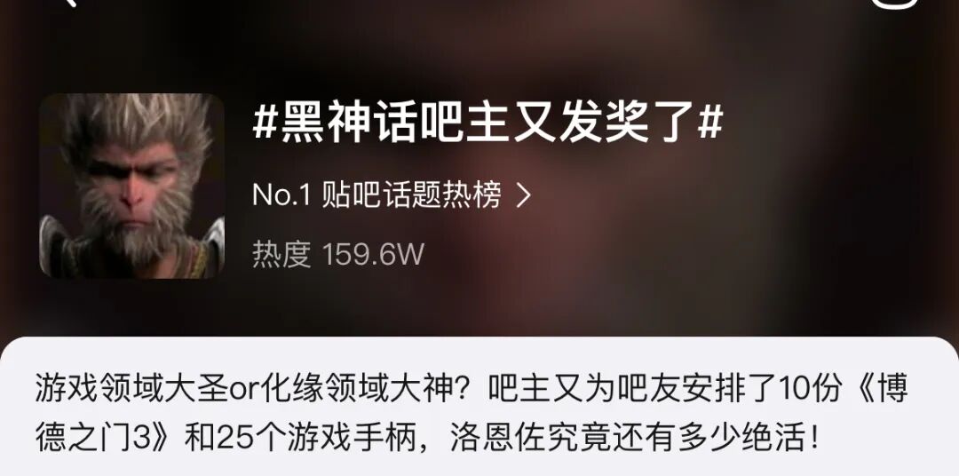 如果大伙最近有关注贴吧热搜榜的话,应该不难发现作为《黑神话:悟空》交流地的“黑神话吧”已经连续两次登上热搜榜首了,而这一切的最大功臣,莫过于黑吧吧主洛恩佐的两次抽奖——两次足够离奇,甚至被大伙调侃为“赛博智取生辰纲”的抽奖。