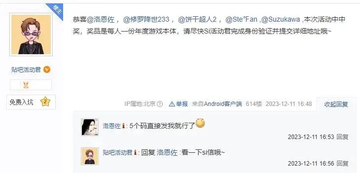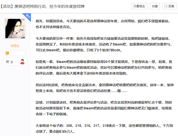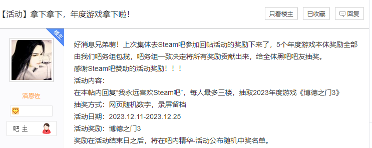 在自己寻求贴吧官方赞助年底抽奖活动无果的前提下,洛恩佐选择依靠“劫道”来给一众黑吧吧友发奖,毕竟唯一的奖品预算“5份年度游戏CDK”给到了steam吧。