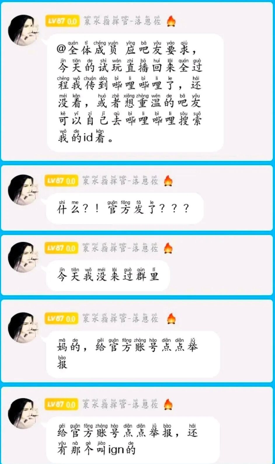 即便在自己没获得试玩资格的情况下,洛恩佐身为黑吧吧主还保持着足够的流量嗅觉和竞争意识,在得知《黑神话:悟空》试玩活动的视频已经有人先自己一步上传B站之后,他便开始鼓动官方交流群的其他群友去点点举报——即便发布视频的是游科和IGN这两个官方账号。