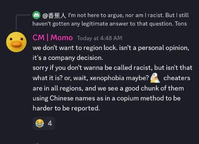 Momo向玩家们保证,他们没有对中国地区锁定的计划,这是公司高层的决定。他解释说,很多使用中文用户名的作弊者其实并不是中国人,他们只是利用中文字符来增加人工审查的难度。他还表示,他们反对一些玩家提出的对中国地区锁定的要求中所包含的仇外情绪和种族主义色彩。