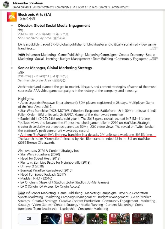 据EA前全球营销高级经理 Alexandre Scriabine 个人领英页面显示,Bioware的科幻机甲射击游戏《圣歌》首周销量为200万份,目前已售出500万份。这是EA从未公开过的数据。尽管数据亮眼,但在2019年5月的财报中 EA CEO明确表示“《圣歌》的发行没有达到我们的预期”,这是因为EA原本预计《圣歌》发售一个月的销量就要达到500万~600万份。