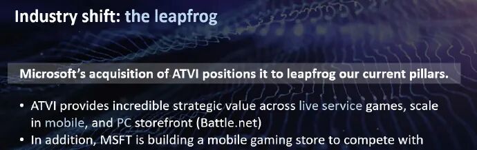 · 收购动视暴雪为微软在 在线服务游戏、手机和PC商店(战网)方面提供了不可思议的战略价值