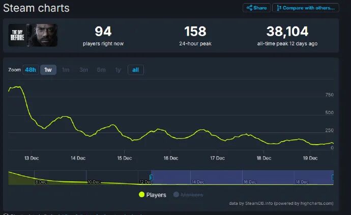 在《浩劫前夕》的最高峰,有38104人同时在线游玩,但到了现在,只剩下94人在线,过去24小时的最高峰也只有158人。而且,游戏的评价几乎全是“差评”。它在Steam上的差评率是最低的十个之一。