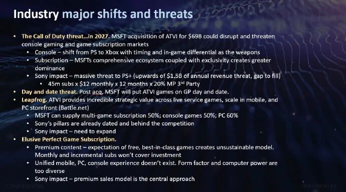 索尼第一方工作室失眠组(Insomniac Games)被 勒索软件组织 公开的内部文件中一张PPT显示,索尼对微软收购动视暴雪后产生的影响表示担忧,索尼将这笔交易称为微软的“跨越式收购”,PS+订阅服务将面临巨大威胁,同时索尼承认自己的当前的“支柱”已经过时并落后于竞争对手。