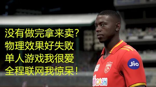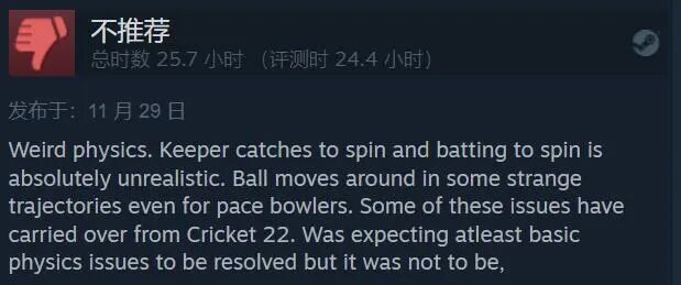 奇怪的物理效果。守门员接球旋转和击球旋转是绝对不符合现实的。球会沿着一些奇怪的轨迹移动,即使是对于快速投球手来说也是如此。其中一些问题是从《板球22》延续而来的。我期望至少基本的物理真实效果问题能够得到解决,但事实并非如此。