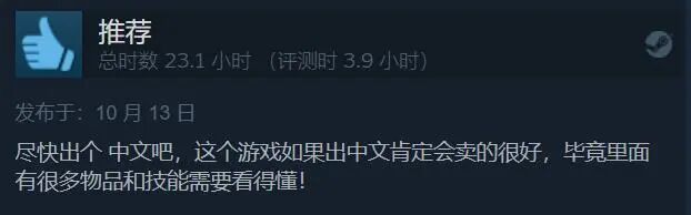 尽快出个 中文吧,这个游戏如果出中文肯定会卖的很好,毕竟里面有很多物品和技能需要看得懂!