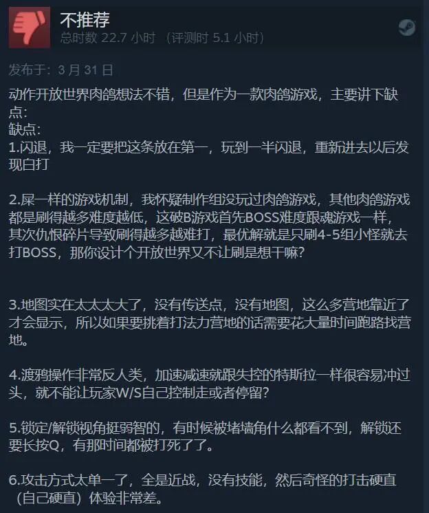 动作开放世界肉鸽想法不错,但是作为一款肉鸽游戏,主要讲下缺点: