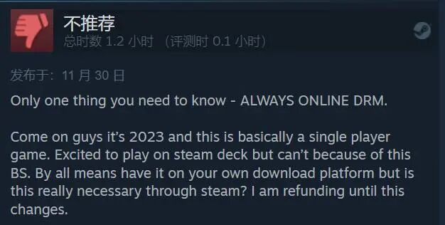 拜托,现在是2023年了,这基本上是一个单人游戏。我很想在Steam Deck上玩它,但因为这个无聊的设定而无法实现。无论如何,你应该在自己的下载平台上下载,但通过Steam玩它真的有必要吗?除非这种情况改变,否则我将退款。