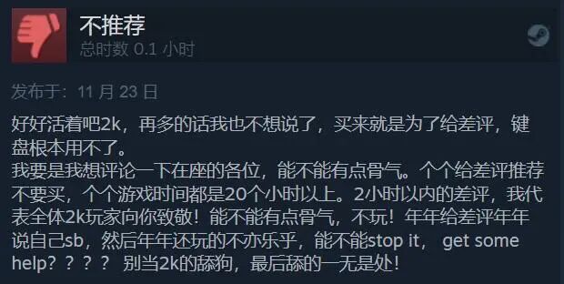 我要是我想评论一下在座的各位,能不能有点骨气。个个给差评推荐不要买,个个游戏时间都是20个小时以上。2小时以内的差评,我代表全体2k玩家向你致敬!能不能有点骨气,不玩!年年给差评年年说自己sb,然后年年还玩的不亦乐乎,能不能stop it, get some help????别当2k的舔狗,最后舔的一无是处!