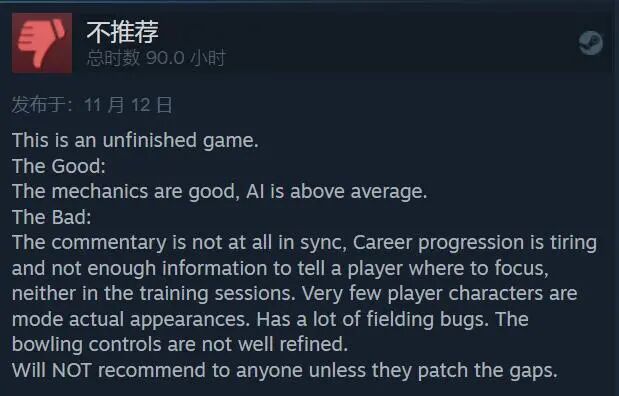 缺点:解说完全不同步,职业生涯进程很累人,没有足够的信息告诉玩家应该专注于哪里,训练环节也没有此类信息。只有很少的比赛选手是真实的外观。有很多防守漏洞。板球投球控制不完善。