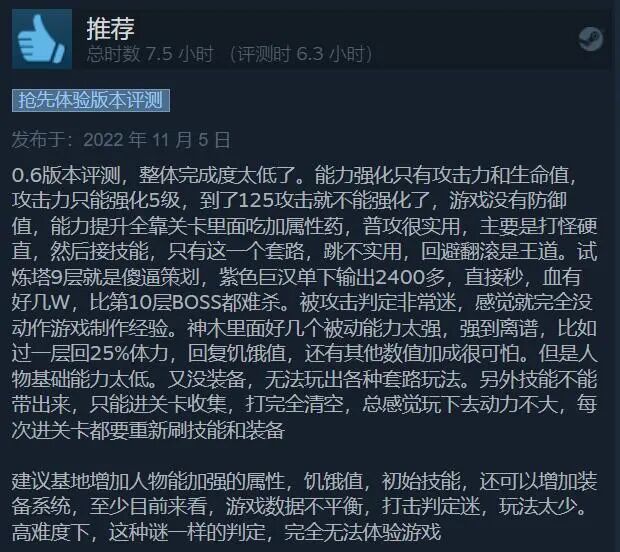 被攻击判定非常迷,感觉就完全没动作游戏制作经验。神木里面好几个被动能力太强,强到离谱,比如过一层回25%体力,回复饥饿值,还有其他数值加成很可怕。但是人物基础能力太低。又没装备,无法玩出各种套路玩法。另外技能不能带出来,只能进关卡收集,打完全清空,总感觉玩下去动力不大,每次进关卡都要重新刷技能和装备