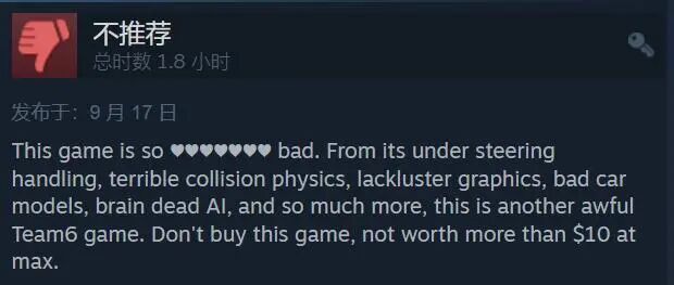 这个游戏太烂了。从它的操作性差、碰撞物理效果糟糕、画面平淡无奇、汽车模型差劲、AI无脑等等,这是又一款糟糕的Team6游戏。不要买这个游戏,它最多值10美元。