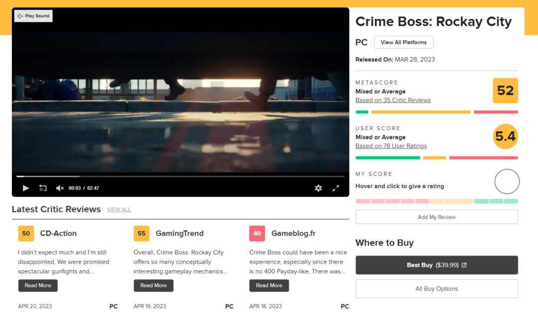 Screen Rant 50/100:目前来看,这款游戏就像是一位低水平的小混混,试图在一个已经有很多优秀多人FPS存在的街区里快速致富。